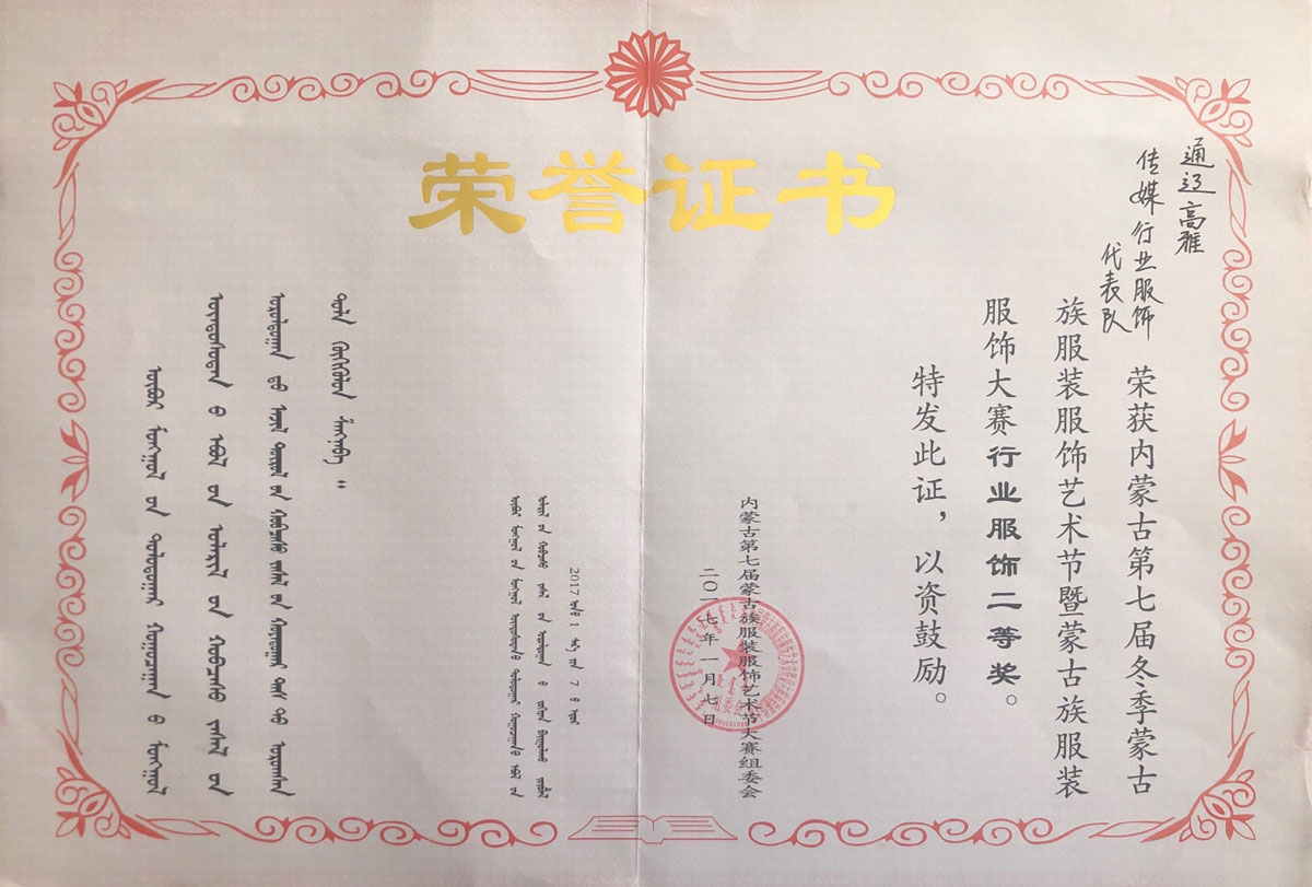 內蒙古第七屆冬季蒙古族服裝服飾藝術(shù)節暨服裝服飾大賽榮獲行業(yè)服飾二等獎